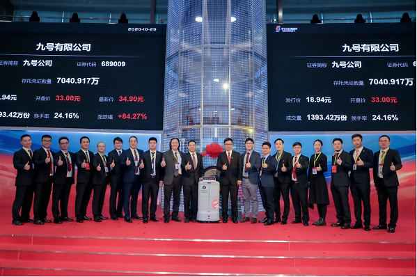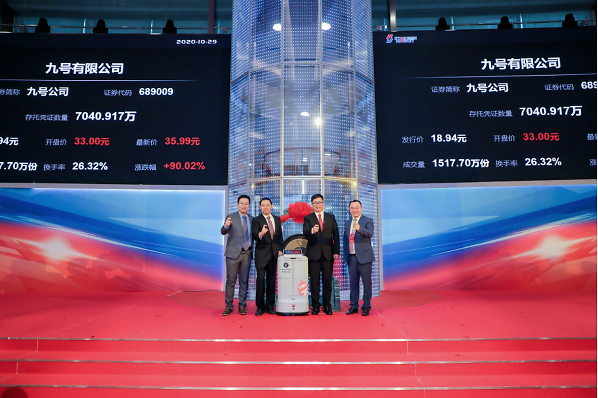 10月29日,九号有限公司(689009)首次公开发行存托凭证并在科创板正式上市,发行价格18.94元/份,开盘大涨74.23%,截至10:25,股价直达38元/股,涨幅超过100%,市值迅速冲破268亿元。值得注意的是,九号公司独出心裁地选择用自家研发的机器人上台鸣锣,开创了A股市场机器人鸣锣上市先河。